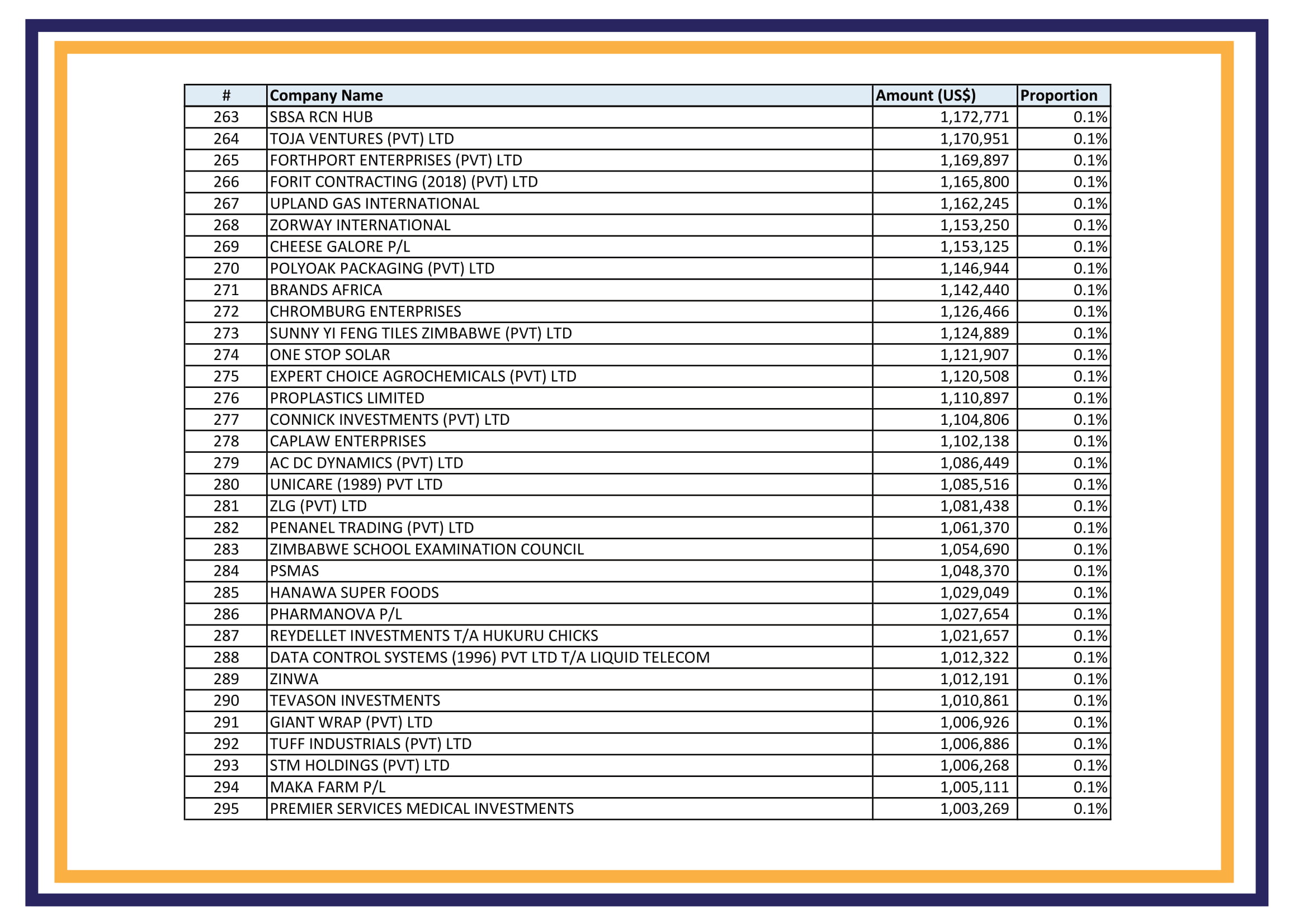 Posted inStories Full list of Zimbabwe companies that received foreign currency under auction system- June 2020 to April 2021 Posted by Charles Rukuni May 14, 2021No Comments Continued next page (1412 VIEWS) Pages 1 2 3 4 5 6 7 8 9 10 11 12 13 14 15 16 17 18 19 20 21 22 23 24 25 26 27 28 29 30 31 32 33 34 35 36 37 38 39 40 41 Charles Rukuni The Insider is a political and business bulletin about Zimbabwe, edited by Charles Rukuni. Founded in 1990, it was a printed 12-page subscription only newsletter until 2003 when Zimbabwe's hyper-inflation made it impossible to continue printing. View All Posts Post navigation Previous Post What Zimbabwe legislators said about traditional medicine-Joshua MurireNext PostWith the MDC in chaos, who can halt ZANU-PF?
