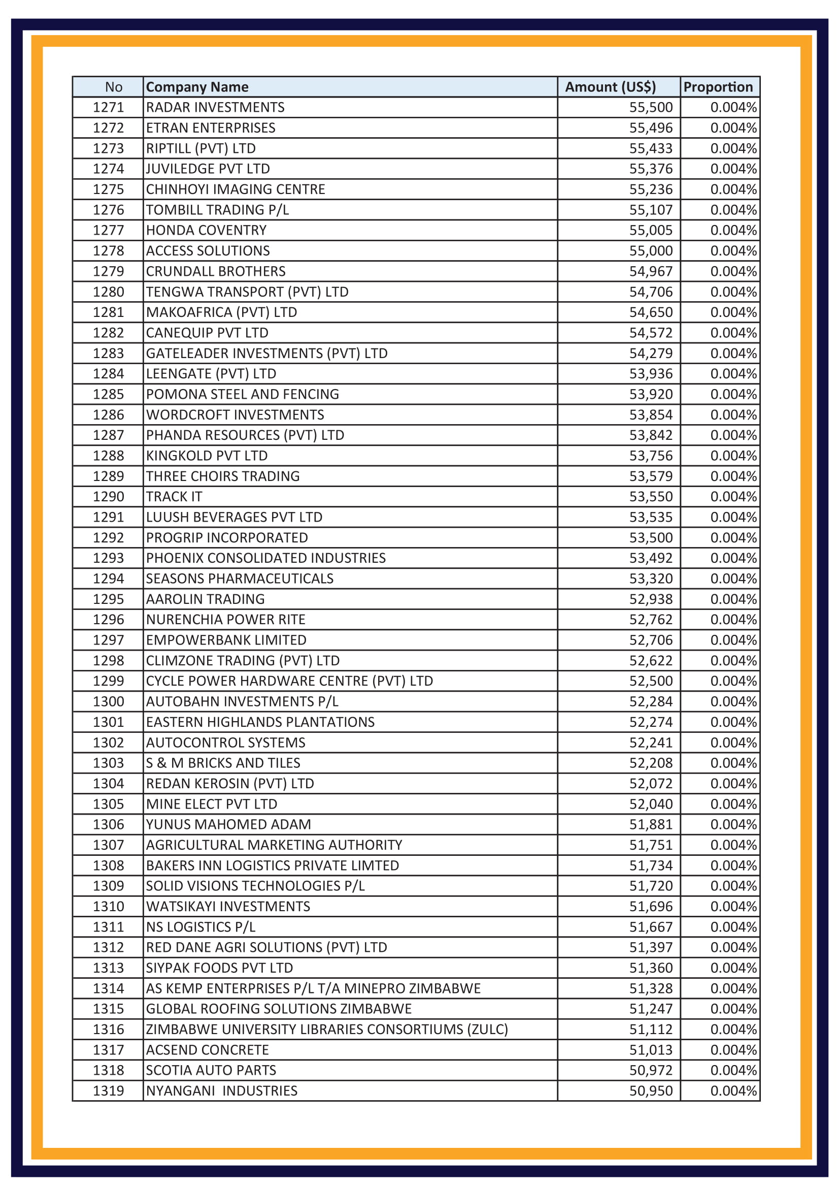Posted inStories List of all 1 423 companies allotted foreign currency through the auction between June 2020 and May 2021 Posted by Charles Rukuni June 5, 20212 Continued next page (1014 VIEWS) Pages 1 2 3 4 5 6 7 8 9 10 11 12 13 14 15 16 17 18 19 20 21 22 23 24 25 26 27 28 29 30 31 Charles Rukuni The Insider is a political and business bulletin about Zimbabwe, edited by Charles Rukuni. Founded in 1990, it was a printed 12-page subscription only newsletter until 2003 when Zimbabwe's hyper-inflation made it impossible to continue printing. View All Posts Post navigation Previous Post Zimbabwe dishes out US$5.5 billion in foreign payments in 11 monthsNext PostList of 2 027 SMEs allocated foreign currency through the auction from June 2020 to May 2021
