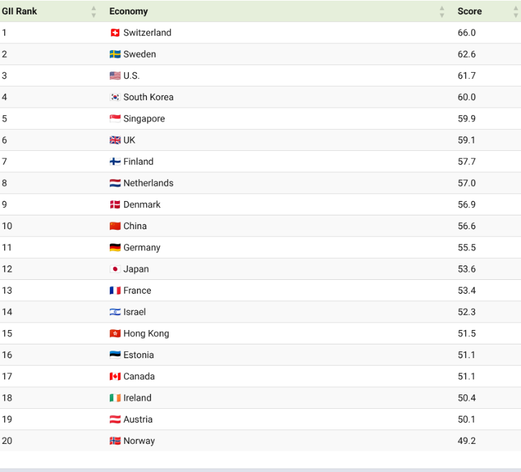 The Global Innovative Index ranks countries on their ability to foster research and entrepreneurship and is based on 78 indicators.