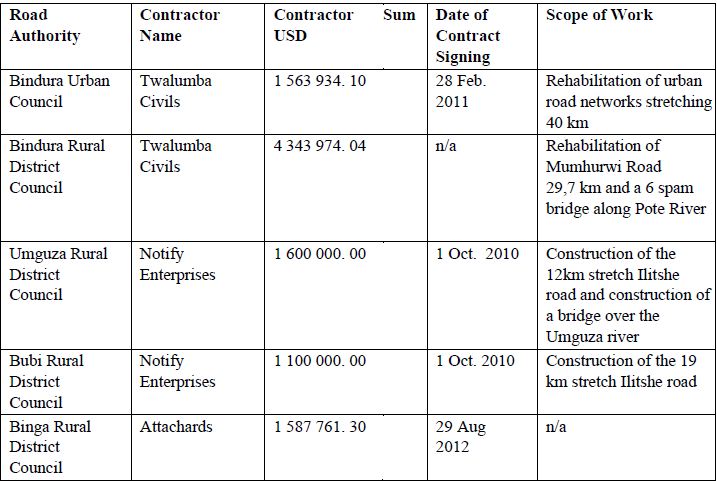 - More shockingly on 26 November 2012, Bindura Municipality entered into another contract with another company Haingate Investments totaling USD 1 639 279.21 to carry out the work that Twalumba ought to have done.