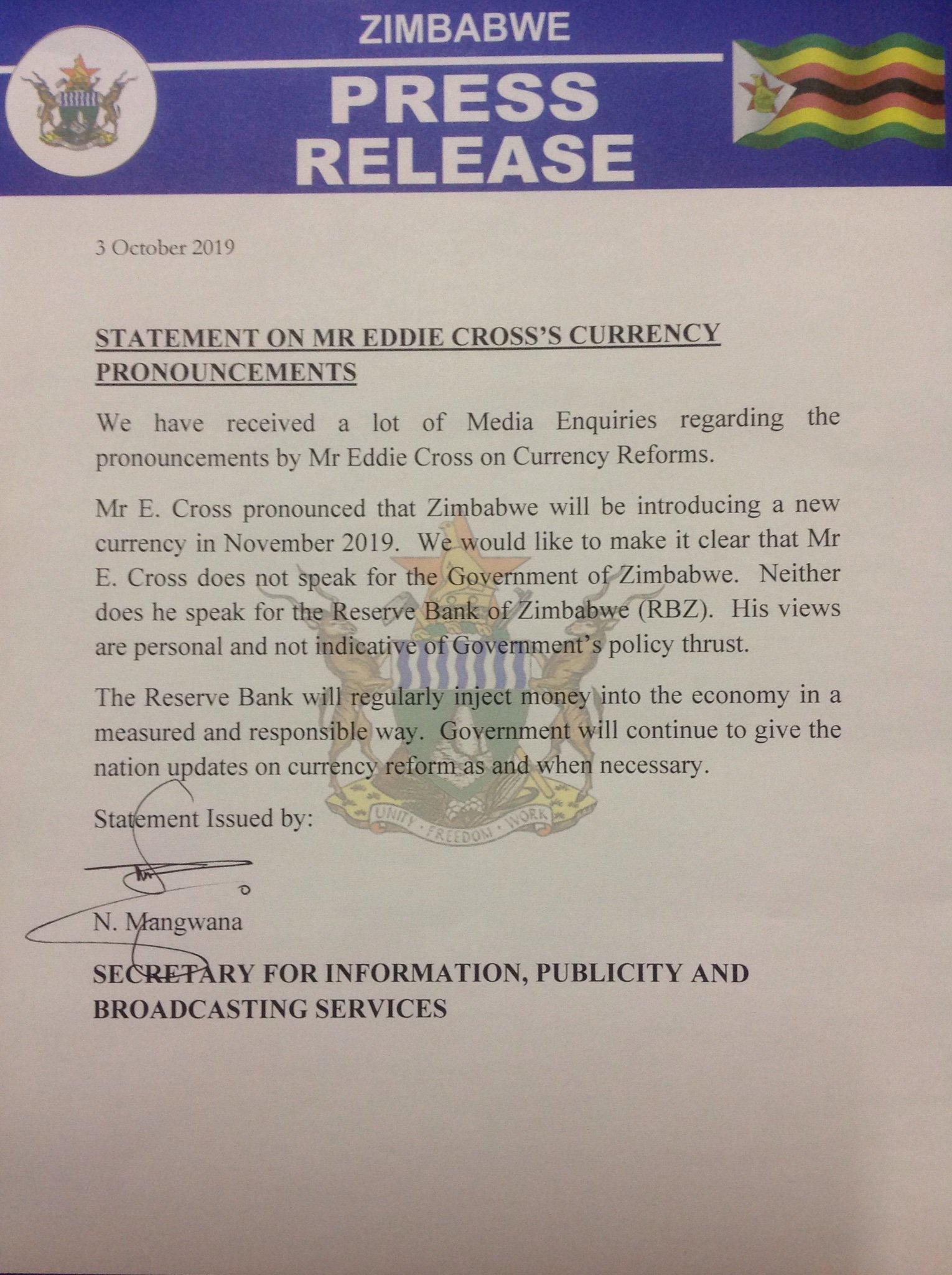 “Mr E. Cross pronounced that Zimbabwe will be introducing a new currency in November 2019. We would like to make it clear that Mr E. Cross does not speak for the Government of Zimbabwe. Neither does he speak for the Reserve Bank of Zimbabwe (RBZ),” Mangwana said.