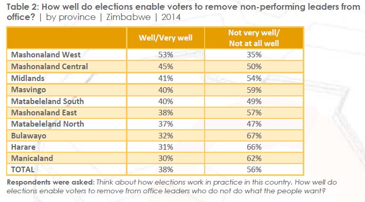 This is all contained in the latest study released by Afrobarometer which shows that even among Zimbabwe African National Union-Patriotic Front supporters, only those from Mashonaland West felt that elections worked very well to remove non-performing leaders. Fifty-three percent felt so.