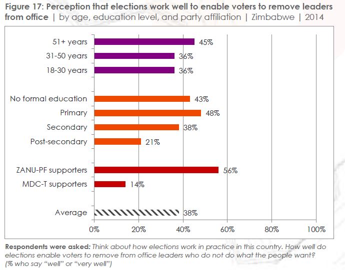 The situation is even worse for the opposition as only a paltry 14 percent of Movement for Democratic Change supporters felt they could vote out non-performing leaders.